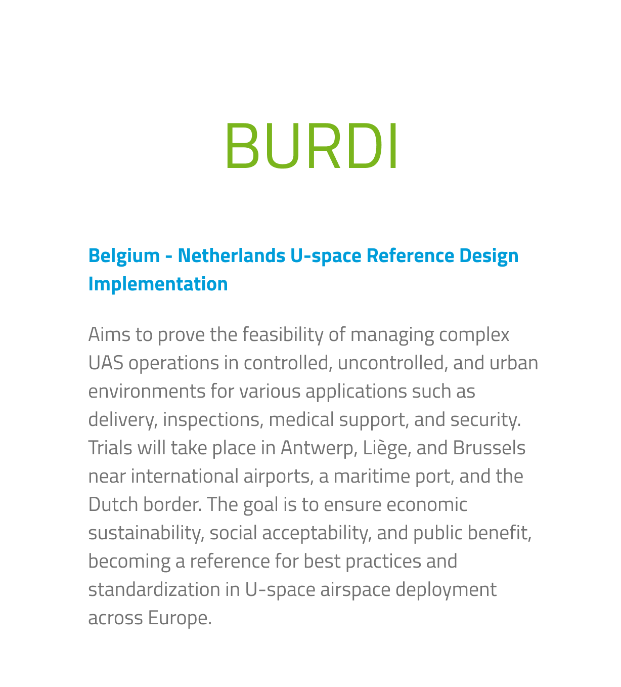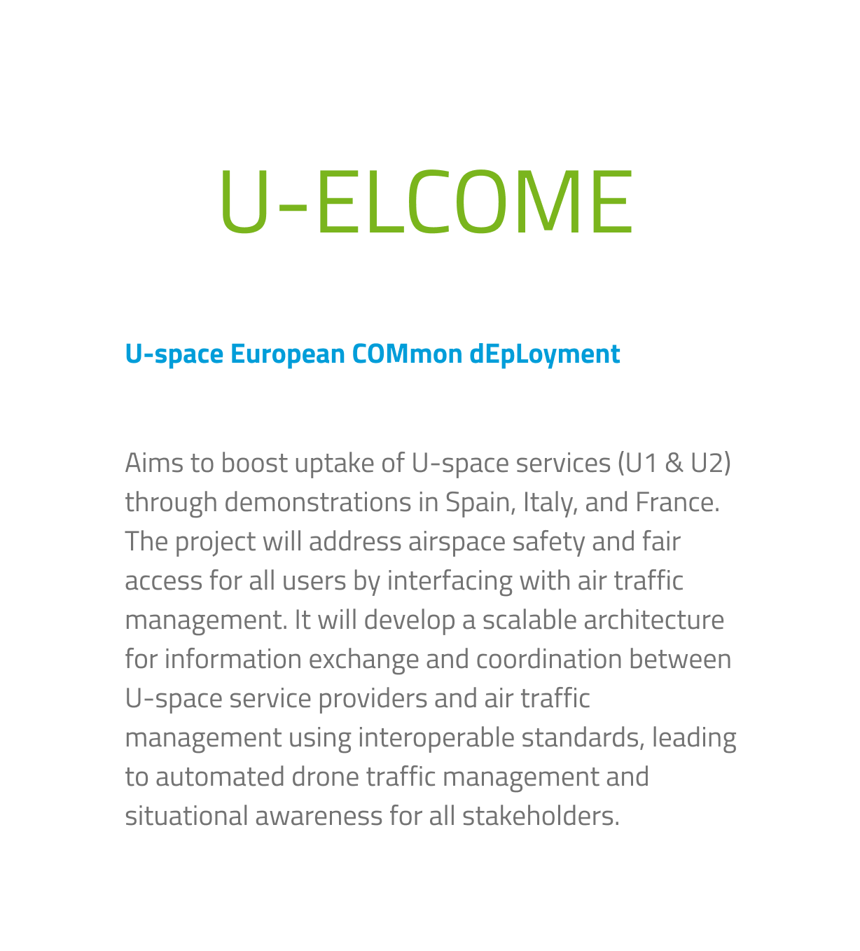 The project will coordinate with wider global activities carried out by EASA, CINEA and other European Agencies, ICAO, EUROCAE, ASTM, ISO, EUROCONTROL and other SESAR Digital Sky Demonstrators addressing U-space and urban air mobility such as U-ELCOME and BURDI.